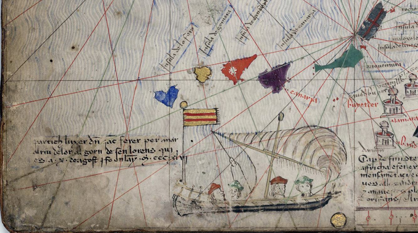 Catalan Atlas: Secant arc and wind measurements are drawn into the sails of the ship.