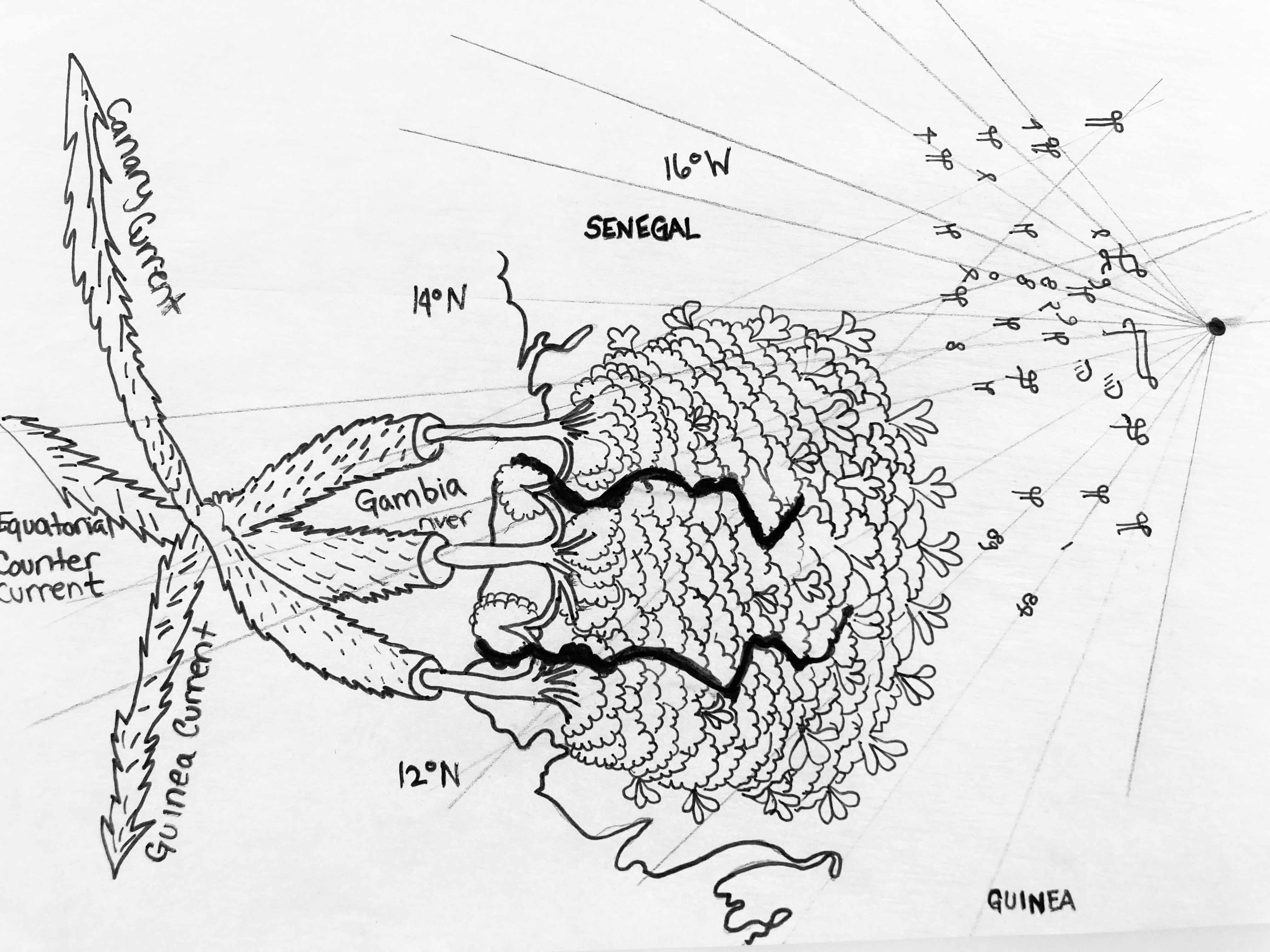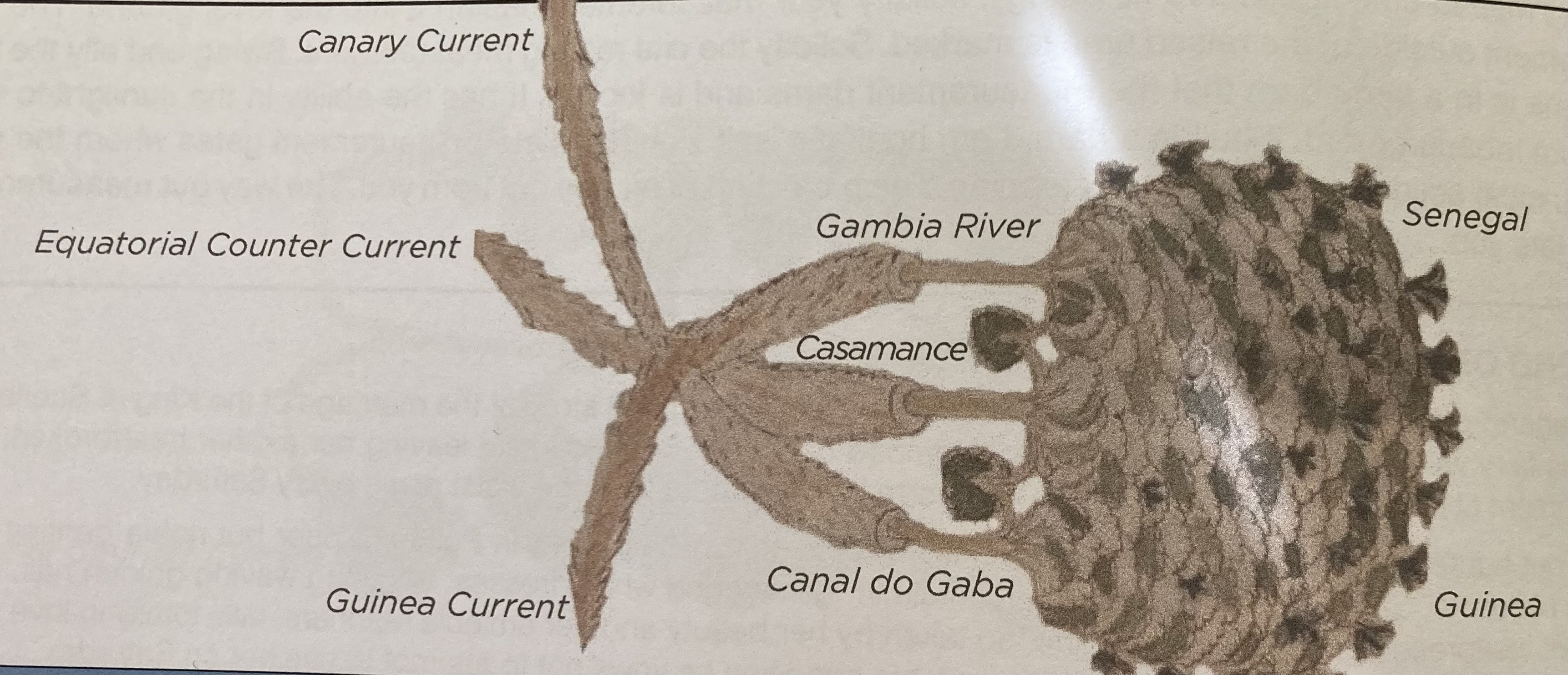 NOTES: Observe the Catalan Atlas and the four guys on a boat. Three of the men have loci lines going through the mouth area. Read the translation of the first paragraph above. The uvula refers to the larger hanging flower between Canal do Gaba and Casamance. To calculate the secant arc it is drawn in the sail of the boat in the Catalan Atlas.