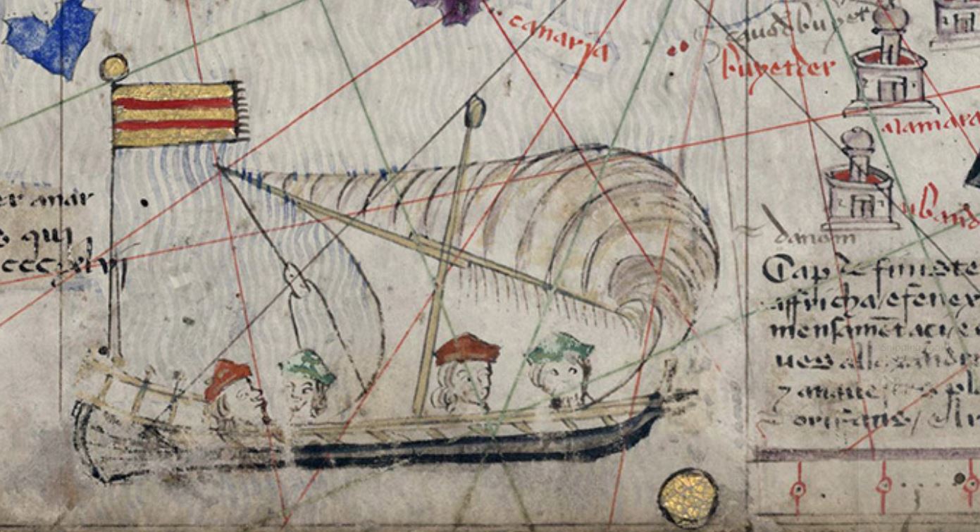Catalan Atlas: The secant arc and wind measurements are drawn into the sails of the ship.