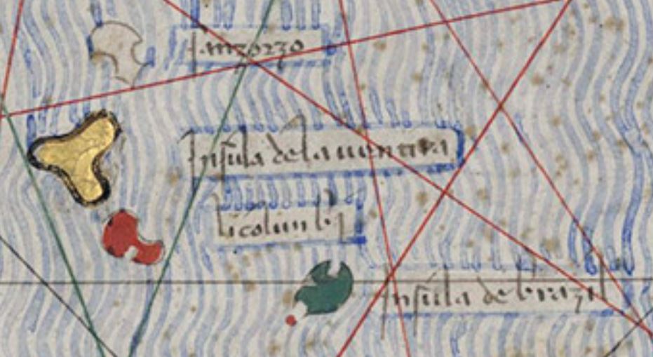 The root system is the likeness of the Polypus Monster, the legendary sea monster with many legs, as ocean and wind streams do. The Polypus Monster in MS408 is a layout of an island in the Azores that has since exploded from a volcano eruption and the possible cause of the Little Ice Age in Europe. The Red Island in the picture to the right is indicative of the root system in Folio 5v.