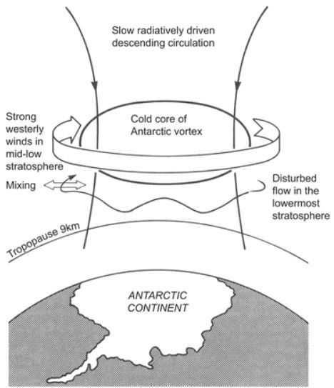 Today in science we would call this the “Southern Circumpolar Vortex’ Outer Axle.” The Antarctic vortex of the Southern Hemisphere is a single low-pressure zone that is found near the edge of the Ross ice shelf, near 160 west longitude. When the polar vortex is strong, the mid-latitude Westerlies (winds at the surface level between 30° and 60° latitude from the west) increase in strength and are persistent. When the polar vortex is weak, high-pressure zones of the mid-latitudes may push poleward, moving the polar vortex, jet stream, and polar front equatorward. The jet stream is seen to “buckle” and deviate south. This rapidly brings cold dry air into contact with the warm, moist air of the mid-latitudes, resulting in a rapid and dramatic change of weather known as a “cold snap”.