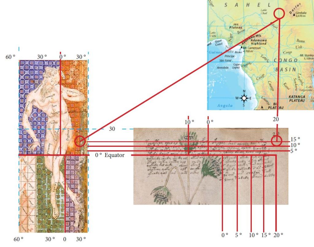 The second major issue with this authors is he practically gives away the map grid. If you are new to my blog and my work the key to the Voynich Manuscript is the Catalan Atlas. They cleverly disguised the Atlantic Ocean by a star chart called “The Zodiac Man.” Though, as we have posted in the past the Atlantic Ocean is actual a map using Poseidon’s image. Around Poseidon is a grid of how they used calculations for a globe shaped Earth. Most authors in the VM hid the grid, this author does not.