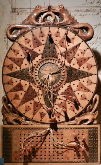 Bourne’s ‘old salt’ is talking about a traverse board, a wooden board with a compass rose drawn on it linked by pegs and cords to a series of peg holes beneath it. It allowed a helmsman to keep a rough check of the time sailed on each rhumb of the wind.” Wikipedia