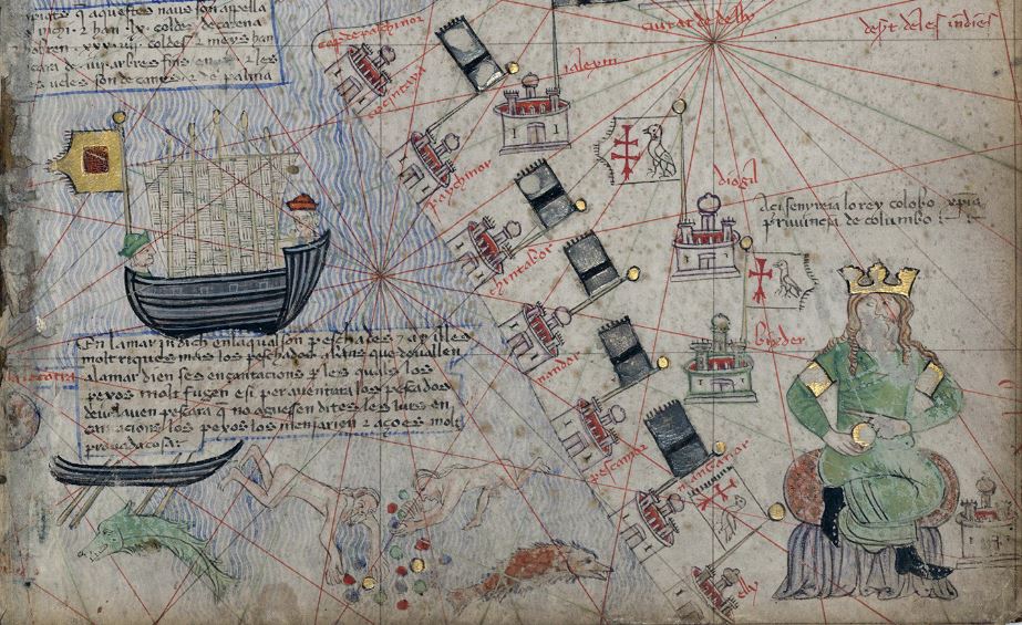 Catalan Atlas: Two naked men diving for pearls in the Indian Ocean is the same position as folio 37r. The Catalan Atlas states “In the Indian Ocean where they are fishermen and very rich islands. The fisherman that descend into the sea say their incantations before diving into the sea and this way they dispel the fish. In the event that they do not say them, the fish devour them, and this has been demonstrated.” Folio 37r has a precision cut in the upper right corner, which is exactly the Catalan Atlas cartographers green line in the Indian Ocean. The folio corrective ligature in the center of the right side is also in the Catalan Atlas cartographers green line in the Gulf of Oman. The folio ligature is in the same position as the gold flag with a red square (the flag for Ilkhanate) is located in the Catalan Atlas.
