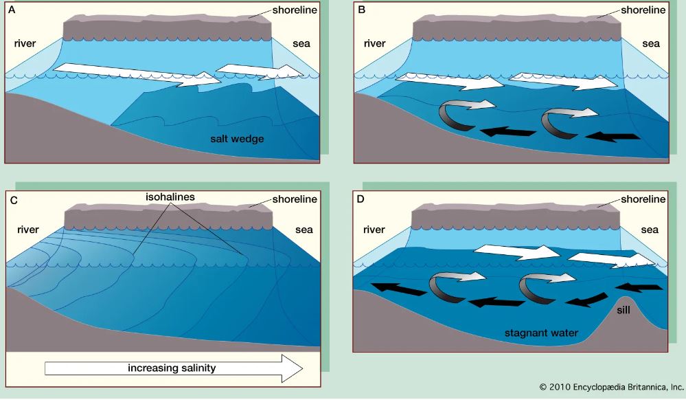 Math: Sri Lanka Estuaries. Estuaries are coastal bodies of water where ocean salt water tides merge with fresh water from rivers. It results in a brackish water zone ocean inlet fed by fresh water.