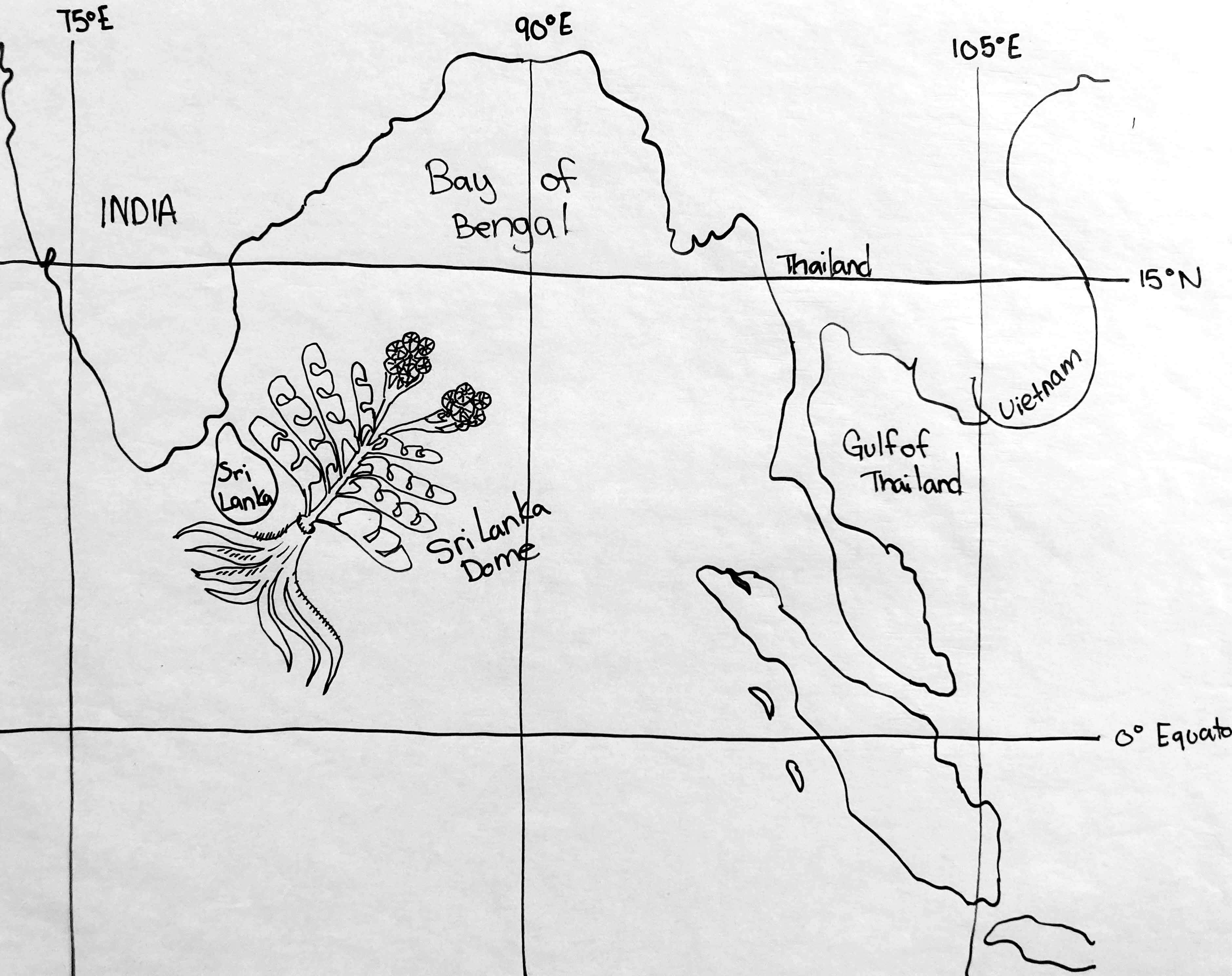 Folio 39v: Sri Lanka Estuaries. Estuaries are coastal bodies of water where ocean salt water tides merge with fresh water from rivers. It results in a brackish water zone ocean inlet fed by fresh water.