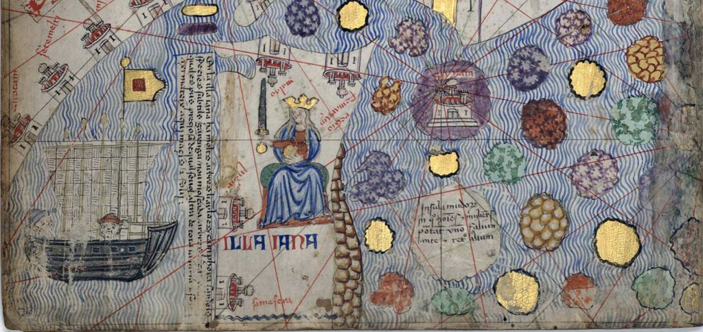 Catalan Atlas: At this location the Catalan Atlas has an inscription reading “Island of naked people, where men and women wear a leaf in front and one in back.” However, such an island does not exist. The Catalan Atlas just like the Voynich has riddles. Given our modern world knowledge one could guess the riddle means this is an exposed area and to protect your ship from the back and front.
