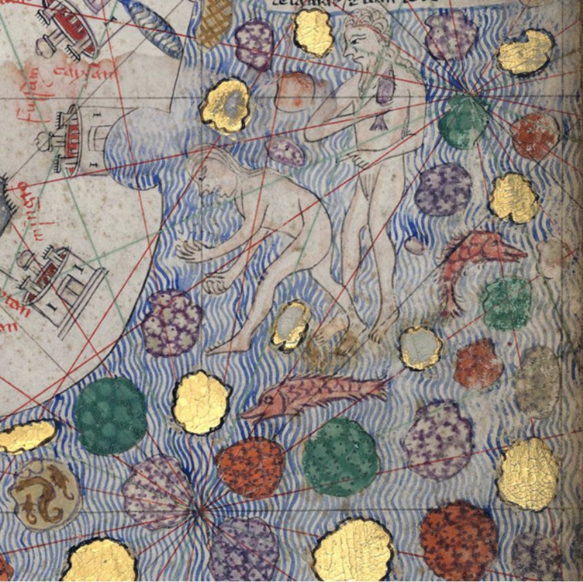 Catalan Atlas: Catalan Atlas used two naked men as the South China Sea Monsoon currents with an inscription saying “These people are savages; they live on raw fish, they drink sea water and go around naked.” Which the author is using a play on words to reference mesoscale eddies in South China Sea Current and not actual people.