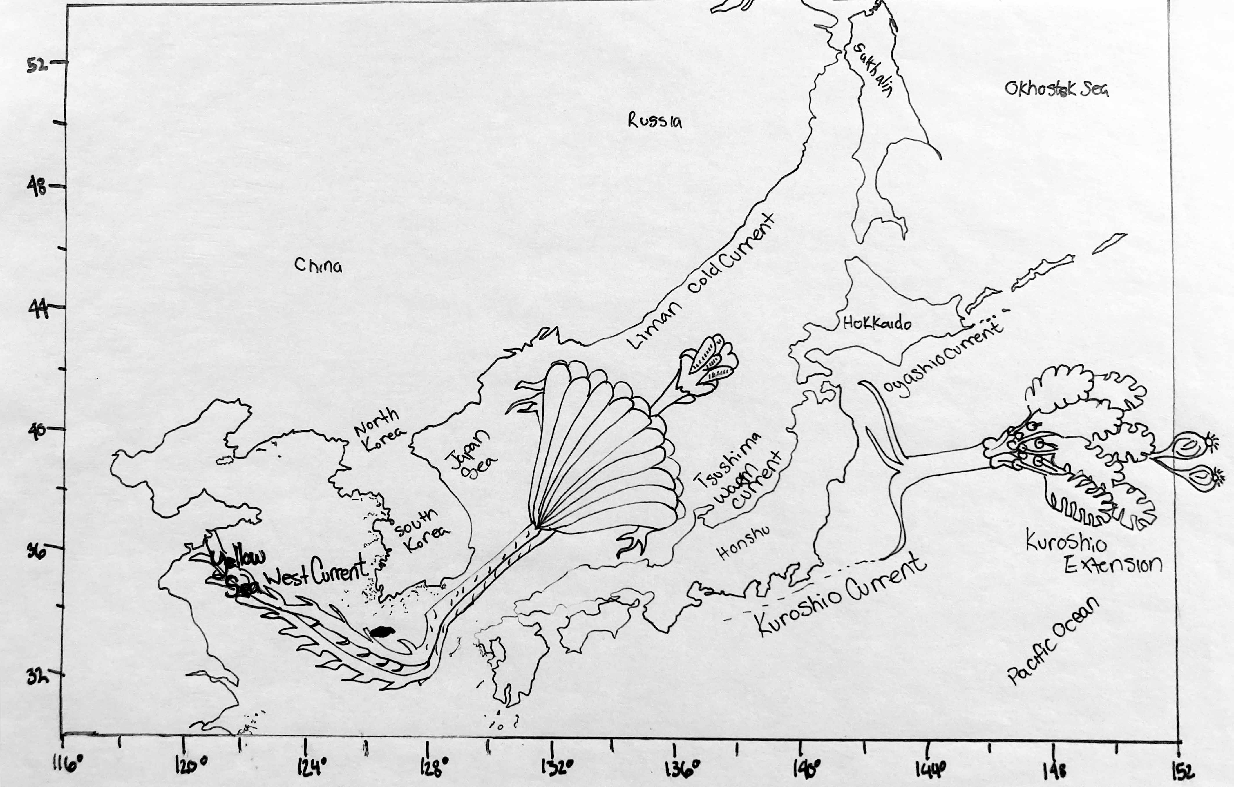 Ocean Currents/Gyre: Yellow Sea West Current; Tsushima Warm Current; Liman Cold Current