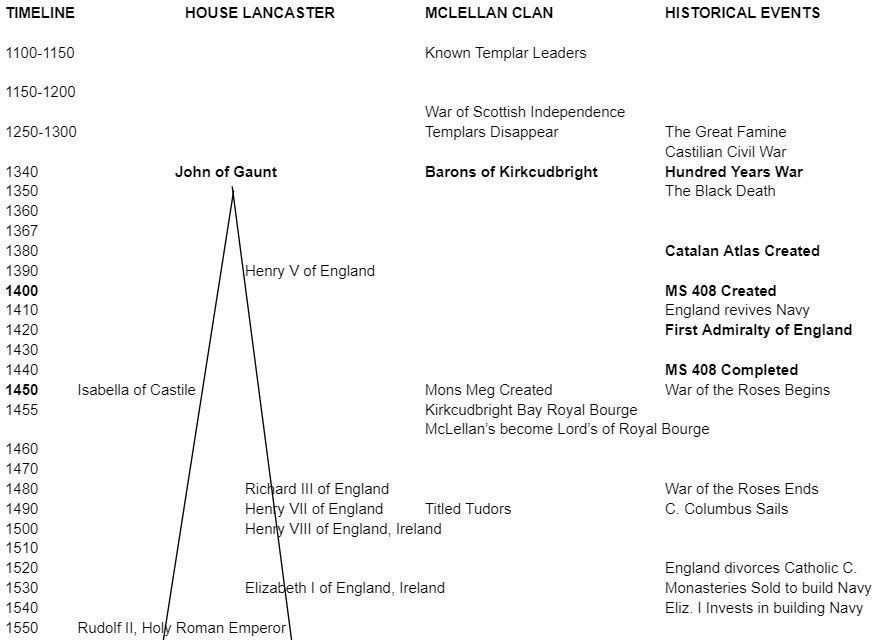 On the following page is a timeline of House Lancaster members whose signatures contain MS 408 symbols; Clan McLellan significant events; and important events that might’ve been influenced by MS408.
