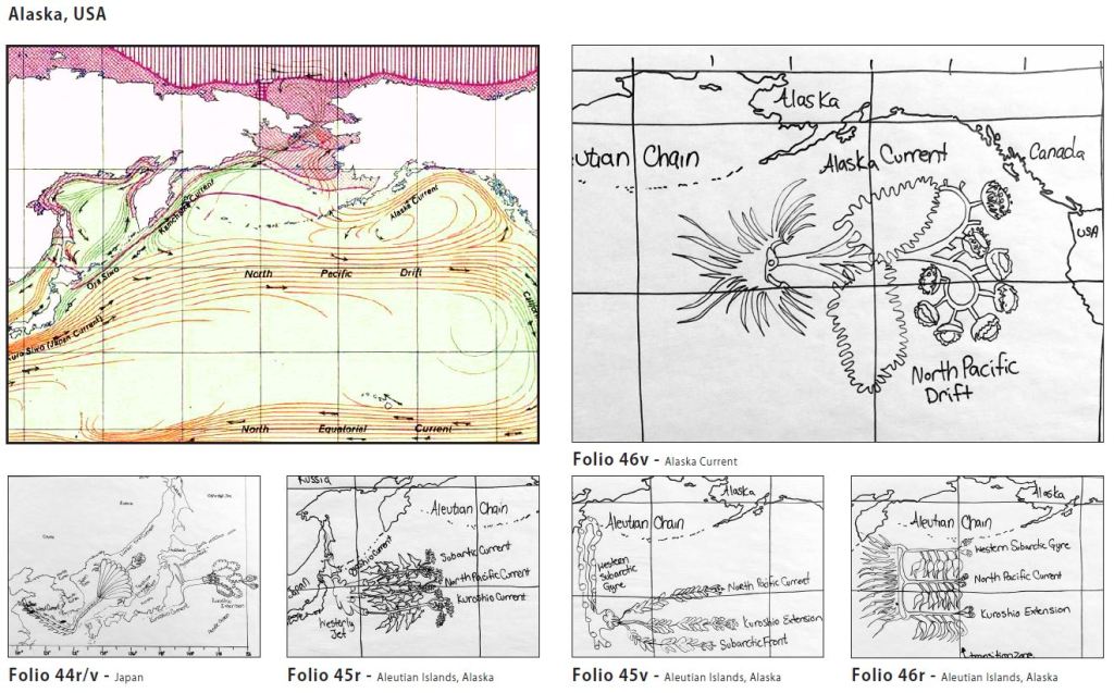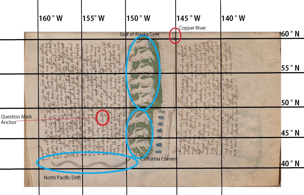 Line 15-16 reads “The verdigris (copper green color) is the momentum way radius passageway speed. There are two things that are happing in this sentence. First it is giving the admiral how fast the Gulf of Alaska Gyre is by a visual ruler drawn in the bottom of the building wall. It leads directly into the Copper River, Alaska. Copper River was given its name based on copper trade since antiquity, a very important location for trade between the Native Tribes, Japan and Russia. Folio 78v is the nautical instructions on how to sail into this very fast flowing and dangerous river basin.