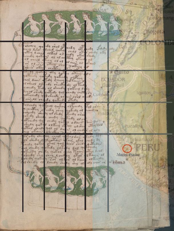 Overlaying Folio 81r against modern maps the blank space on the page is South America (see images below.) There is a great deal of distortion on the scans of the Voynich Manuscript as well as projection distortion of the maps so what is seen is not perfect, but it’s almost perfect. The translation on this page tells the readers to exit Machu Picchu and go straight into Christmas Island they need to follow the fault lines out of the Equator at 0. One does not need to know math to follow the instructions with modern maps on the internet. We have 600 hundred years of information online to connect the dots. Despite my mathematician’s efforts to inform you. You don’t need to know math, you just need to know how to read a map.