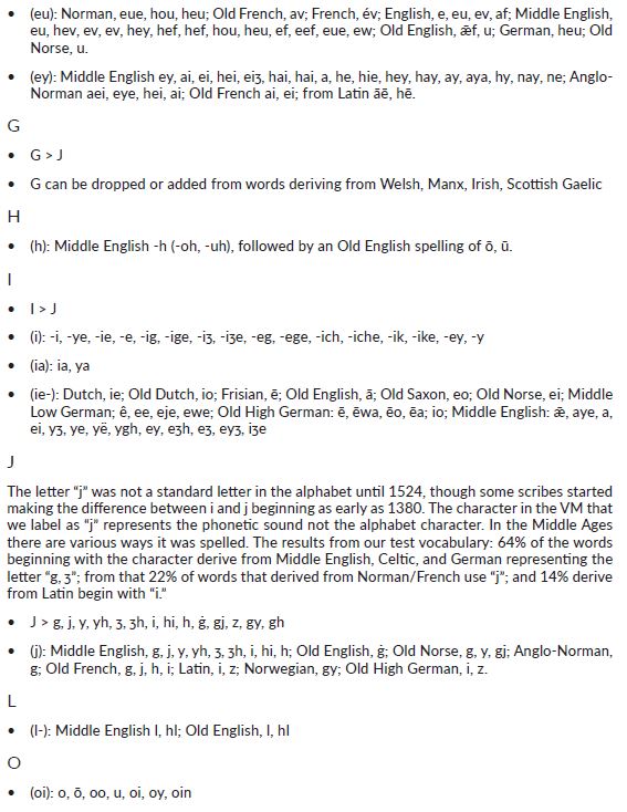 One of the most complicated aspects of the VM language is that its major roots are Middle English. Middle English had no consistent spelling rules; words were generally spelled phonetically, reflecting how they were pronounced by the writer or scribe. Five scribes spanning across multiple generations add another layer of complexity. This meant that the same word could be spelled in multiple ways, even within the same text by the same scribe. and.. it isn’t wrong. In my Book “The Lost Language of Braveheart and Robert de Bruce King of Scots,” some of the phonetic choices in the VM were laid out. After 4 years since I’ve published this book, I refer to this chapter on a daily basis.