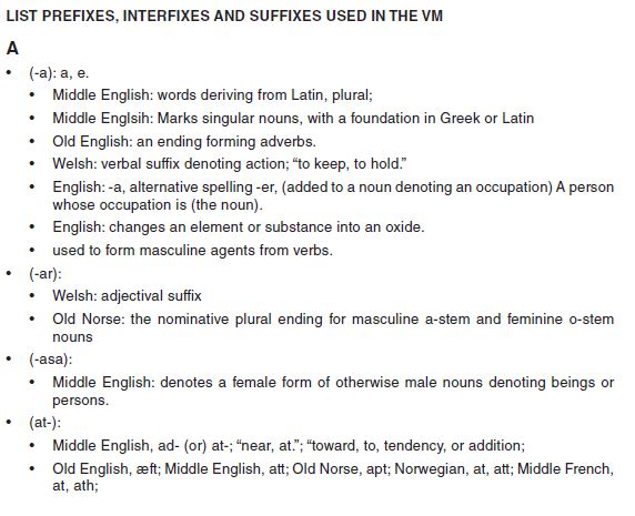 Follow the rules by the letter. If the prefix is Middle English the suffix will be Middle English; if the prefix is Scots/Welsh/Irish the suffix is Welsh. Borrowed words from French, Norwegian, or Dutch would have Middle English suffixes. The exact location of who used the manuscript is vital to weeding out double etymology choices. The language in the VM in based in Galwegian, spoken by The Stuarts, McLellan Clan and House Lancaster. They all spoke Middle English, Norman, Galwegian, Welsh, and Latin, amongst other languages. The McLellan clan historically are known by being Nordic Lords/Templars and eventually Barons of Scotland and Tudors.