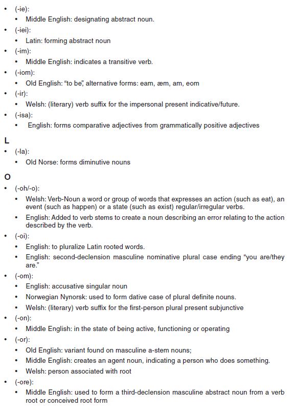 The following list of prefixes, interfixes and suffixes all found in the VM. It is not a complete list.