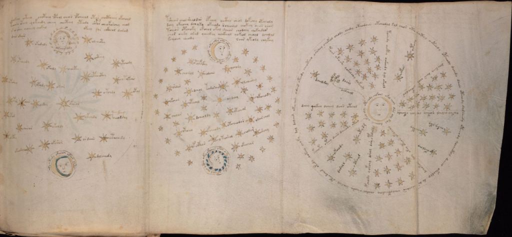 We used archeoastronomy and geodesy to identify Latitude and Longitude calculations in a 14th Century manuscript Yale Beinecke MS 408. The calculations identify the observers locality which was provided in a star cluster pattern on the left-most image of Folio 68r. By comparing the image on Folio 68r to a modern star map of the northern nights sky it was possible to calculate the location of the observer. That calculated location was 55⁰ N / 4⁰ 15′ 00″ W, +/-1⁰ in both directions. By measuring the angle of obliquity, it became possible to calculate a date of April 9, 1413. This has immense implications for the language, associated culture, history, and purpose of MS 408.